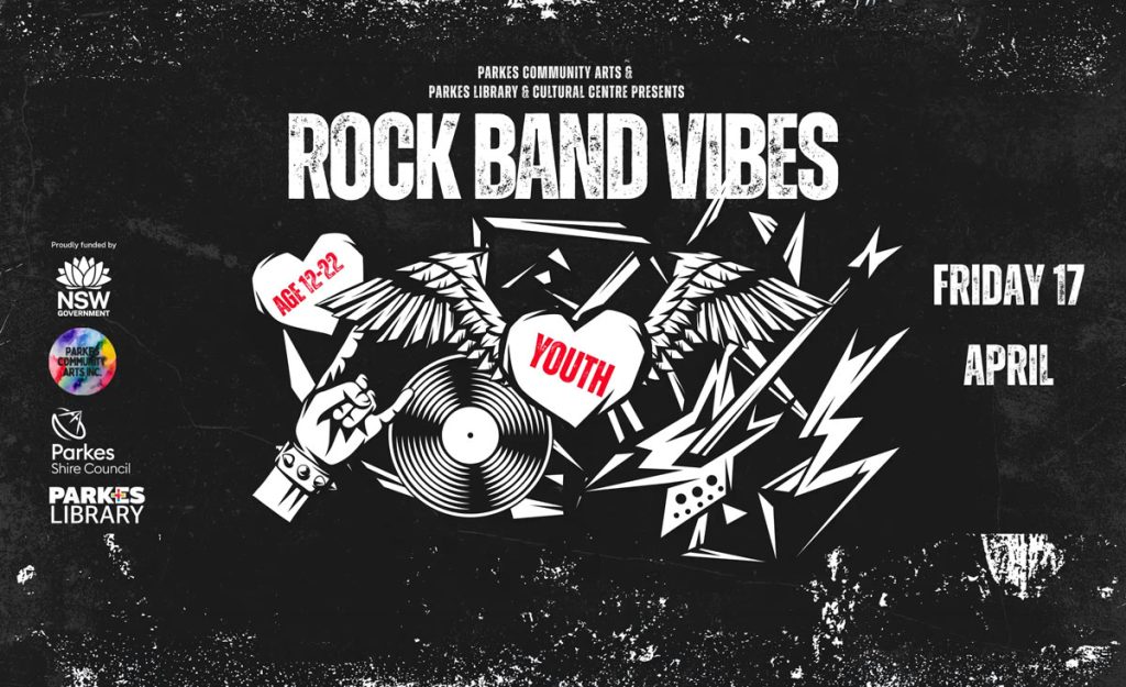 This event is part of NSW Youth Week from 16 – 26 April and is proudly supported by Parkes Community Arts and the Office for Youth (Department of Communities and Justice). For information contact Parkes Library on 6861 2309 or book your spot at https://events.humanitix.com/rock-band-vibes-youth-event